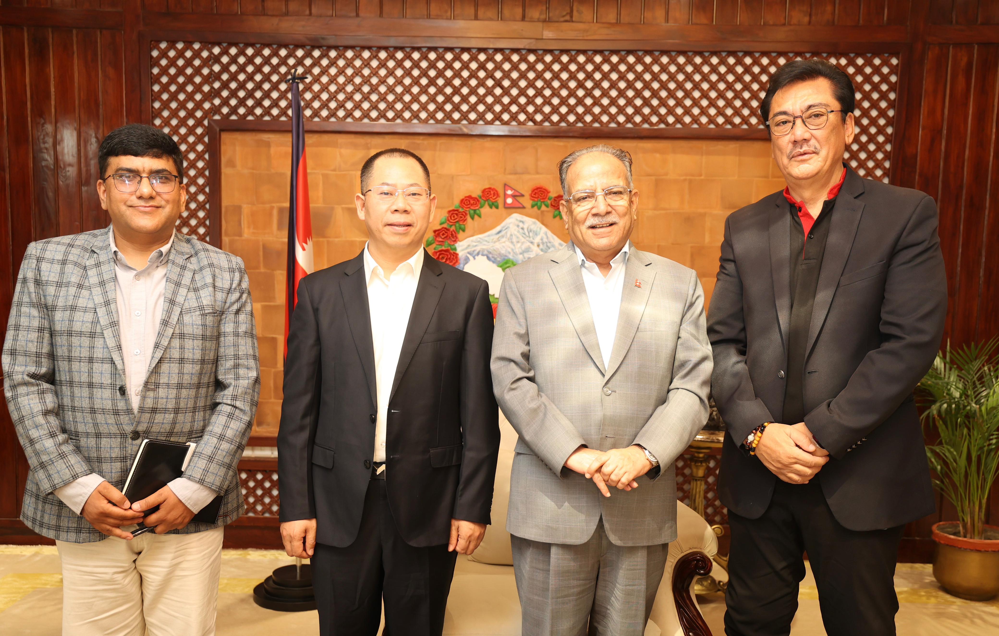 尼泊爾國家總理普拉昌達(dá)(右二)會見華新尼泊爾納拉亞尼公司總經(jīng)理向長宏一行